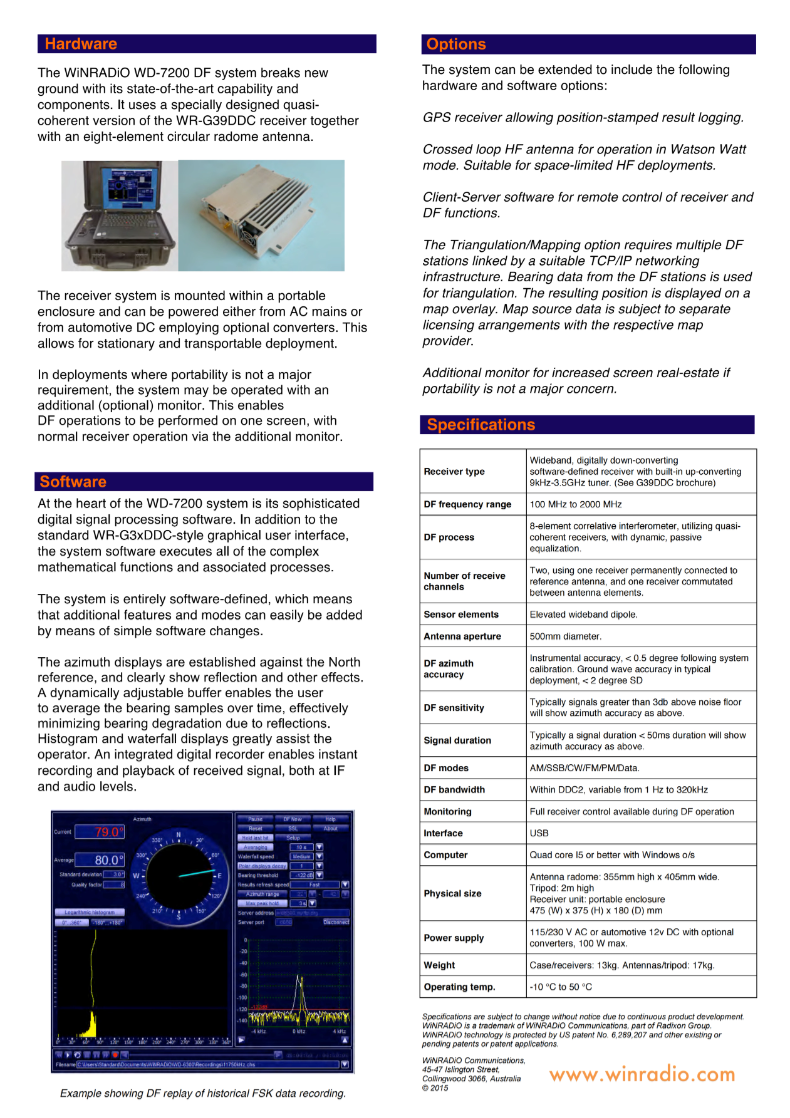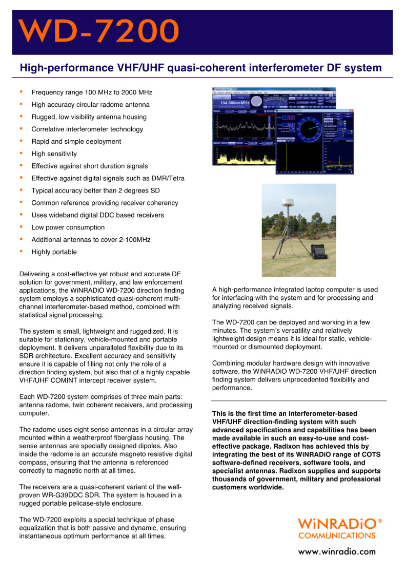 WiNRADiO WD-7200 无线电测向系统采用复杂的相关矢量匹配干涉仪 RDF 方法,并结合了统计信号处