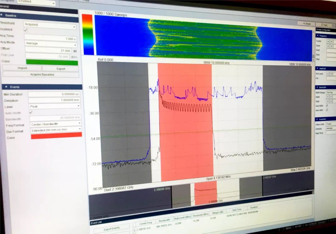 以确定它们是否可能引起麻烦。在我们观察扫描时,信号是否出现在违反基线的频谱上,它在绘图上用红