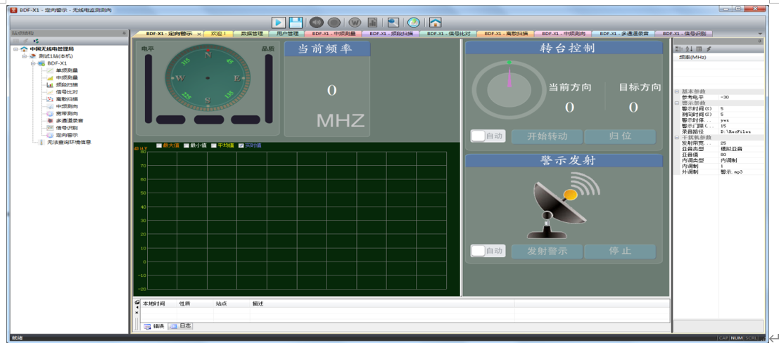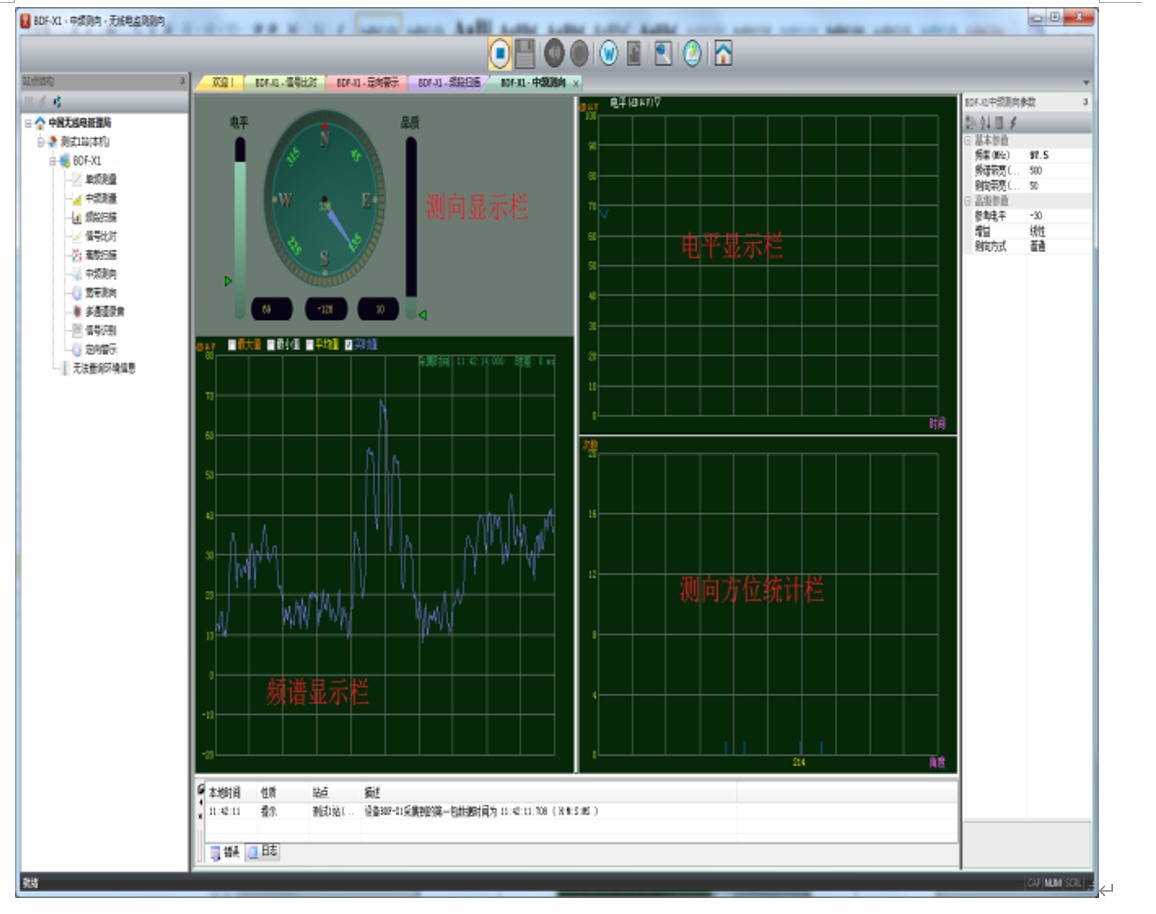 式、位置等),以及定向警示的发射覆盖区域。定向警示显示区域包含五大块:测向显示区,频谱显示区、