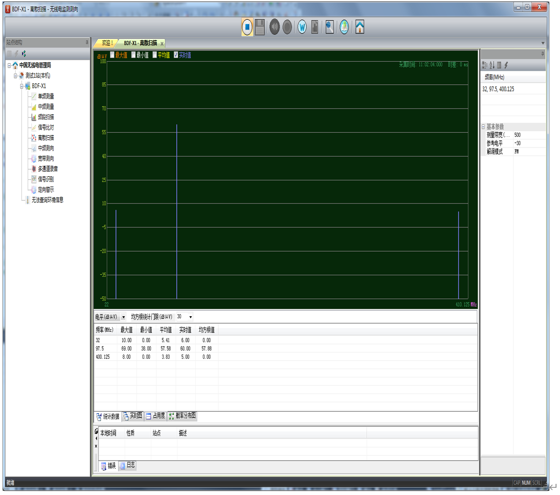 用户可以手工或固定格式的文本文件中获取离散频点。通过离散扫描可以获得每一频点的电平值,计算占用度,