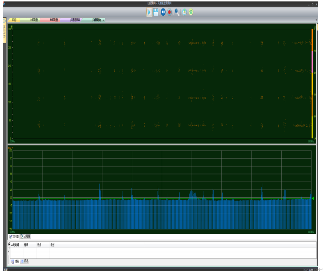 频率的来波方向、品质,分别以柱状图、数字和示向圆盘显示。