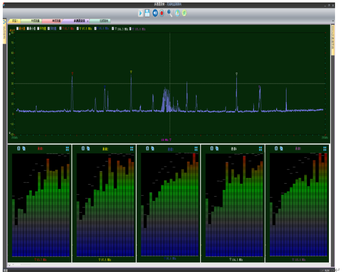 系统可以得到每一频点的实时值、最大值、最小值、平均值,用户可以选择显示其中一条或多条曲线。所有数据